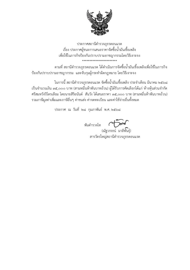 ประกาศผู้ชนะการเสนอราคาจัดซื้อน้ำมันเชื้อเพลิง