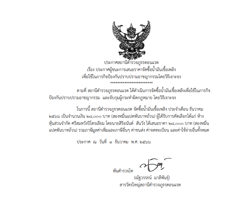 ประกาศผู้ชนะการเสนอราคาจัดซื้อน้ำมันเชื้อเพลิง